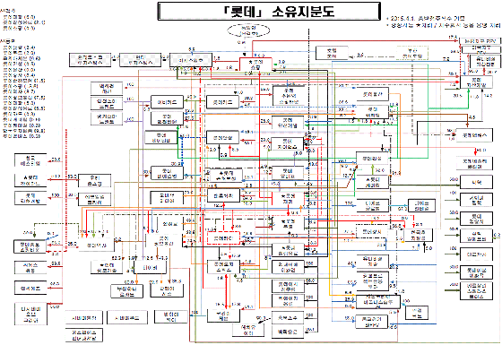 한국 롯데그룹은 지주사격인 호텔롯데를 중심으로 416개 계열사가 서로 얽힌 복잡한 순환출자 구조로 연결돼 있다. 한국 롯데그룹의 정점에 있는 호텔롯데 지배는 일본 롯데홀딩스다. 여기에 일본롯데홀딩스는 광윤사의 지배 아래 있고, 광윤사는 신격호 총괄회장 등 롯데 총수 일가가 지배력을 행사하는 것으로 추정된다.